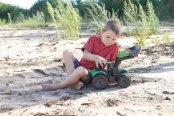 Der Anhänger mit Kippfunktion ermöglicht das schnelle Ausleeren des transportierten Materials und erweitert die Spielmöglichkeiten.