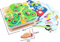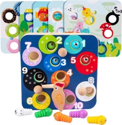 Dieses 2-in-1-Lernspiel aus Holz bringt Kindern Freude am Entdecken. Die drehbaren grünen „Blätter“ verbergen magnetische Würmchen und fügen dem Spiel ein Element der Überraschung und Herausforderung hinzu. Das hölzerne Vögelchen mit magnetischem Schnabel hilft Kindern, genau zu zielen, die Würmchen zu fangen und in Öffnungen zu legen – das stärkt die Feinmotorik und die Geduld.