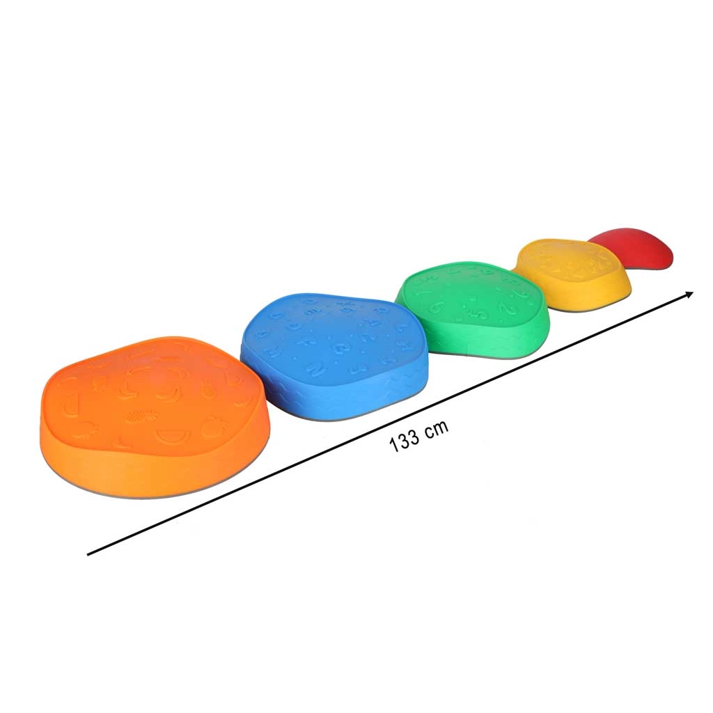 Dank der stabilen Konstruktion und rutschhemmenden Auflagen bleiben die Steine auf verschiedenen Bodenarten sicher an Ort und Stelle. Das robuste Polyurethan ist angenehm zu berühren und leicht zu reinigen. Bunte Motive (Zahlen, Buchstaben, Formen, Obst, Muster) unterstützen spielerisches Lernen und die Entwicklung der grob- und feinmotorischen Fähigkeiten.