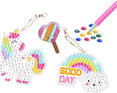 Die Vorlagen und Stellen zum Aufkleben der Diamanten sind markiert – es sind keine besonderen Fähigkeiten erforderlich, um originelle Aufkleber und Schlüsselanhänger zu erstellen. Es ist eine entspannende Tätigkeit, die Konzentration, Geduld und manuelle Geschicklichkeit fördert. Ideal sowohl für individuelle Kreationen als auch für Spaß mit der Familie.