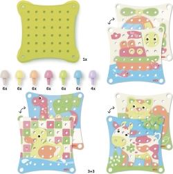 Entdecken Sie die Welt der Farben und Formen mit dem Mosaik *Jumbo Peggy Evo*. Speziell für Kinder ab 2 Jahren entwickelt, fördert dieses Spielzeug ihre *Kreativität* und *manuellen Fähigkeiten*. Kinder können die Stecker nicht nur in die illustrierten perforierten Karten stecken, sondern auch *hohe Türme* damit bauen, was ihre Konstruktionsfähigkeiten unterstützt.