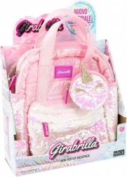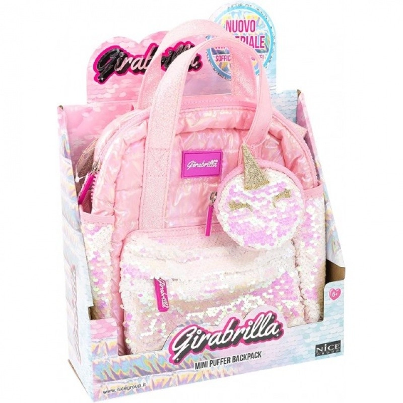 Stilvoller rosa Mini-Rucksack aus weichem, schimmerndem Stoff beinhaltet bunte Pailletten-Taschen und eine einzigartige Einhorn-Geldbörse.