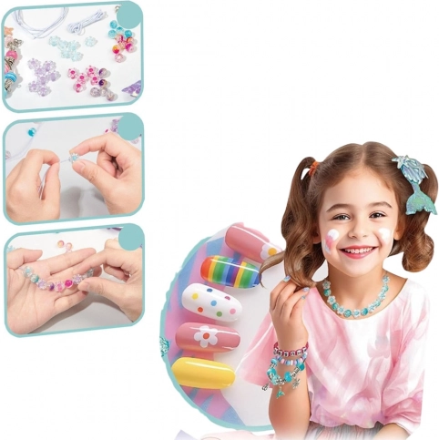 Das Set ist für Mädchen konzipiert, die schimmernde Verzierungen, Ozeanfarben und die Herstellung eigener Accessoires lieben. Dank der vielfältigen Elemente – von bunten Perlen über Nagelkunst-Aufkleber bis hin zum dekorativen Kamm in Form einer Schwanzflosse – können Kinder ihre eigene Schmuckkollektion im Meeresstil gestalten.