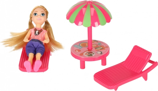 - Das Zubehör umfasst Sonnenschirm, runden Tisch, Liegestühle und sogar einen Grill mit Feuerstelle.