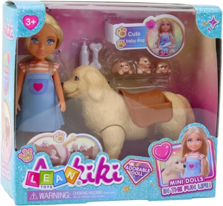 Der Set Mini Puppe mit Hund und Welpen enthält eine 13 cm große Puppe, gekleidet in ein farbenfrohes Trägerkleid und rosa Schuhe. Ihr zartes Gesicht und langes blondes Haar verleihen der Puppe einen einzigartigen Charme.