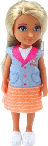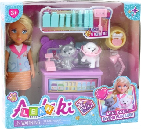 Entdecke die Welt der veterinärmedizinischen Pflege mit der Mini-Puppe, die nur 13 cm groß ist. Gekleidet in einem stilvollen Outfit einschließlich Sportschuhen und einer Bluse mit dem Aufdruck 'Pet', werden Kinder sie auf den ersten Blick lieben. Realistische Accessoires beinhalten auch einen Hund und eine Katze, die Hilfe benötigen, sowie einen Medizinschrank mit vielen Zubehörteilen.