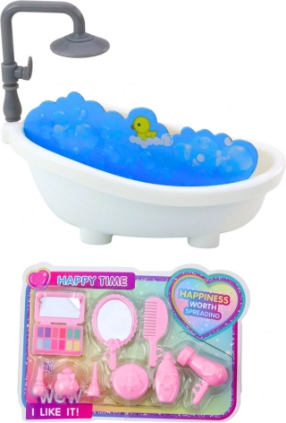 Das Hauptelement des Satzes ist eine geräumige, weiße Wanne mit realistischem Schaum und einer Gummiente. Dazu gibt es kosmetische Accessoires wie eine Bürste, einen Spiegel, einen Föhn und andere Utensilien, die das Spiel um tägliche Hygienerituale und Entspannung erweitern.