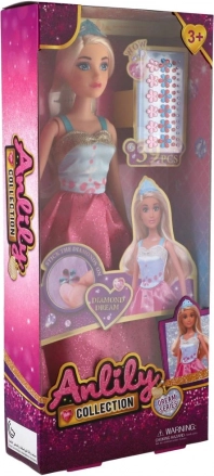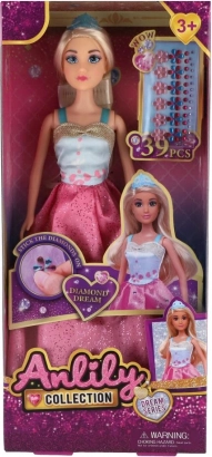 Die 30 cm große Anlily-Puppe bezaubert mit einem eleganten, glitzernden Kleid in Rosatönen und Details in Blau und Gold. Den Stil ergänzen ein Haarreif und realistisch wirkende, lange Haare, die zum Kämmen und Frisurenmachen einladen. Im Set enthalten sind kleine „diamantene“ Verzierungen, die dem Spiel eine luxuriöse Note verleihen.