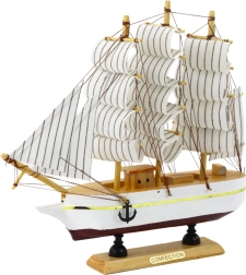 Diese Replik ist aus Holz gefertigt und handgefertigt vollendet, was ihre Authentizität und Qualität gewährleistet. Die Kombination aus dem hellen Rumpf und den schwarzen Streifen auf den weißen Segeln bildet einen visuell beeindruckenden Kontrast.