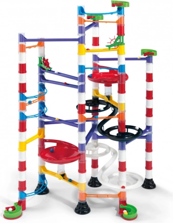 Bunte Kugelbahn für Kinder ab 6 Jahren, die ihre Kreativität und Vorstellungskraft fördert. Durch den Zusammenbau der Teile können Kinder abwechslungsreiche Strecken mit Brücken, Spiralen und weiteren Hindernissen schaffen, die beim Beobachten Spaß machen.