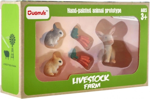 Set mit 3 Plastik-Kaninchen und Zubehör. Fördert Fantasie und Feinmotorik, ideal für Puppenhäuser und Bauernhöfe. Kompakte Größe, Geschenkverpackung.