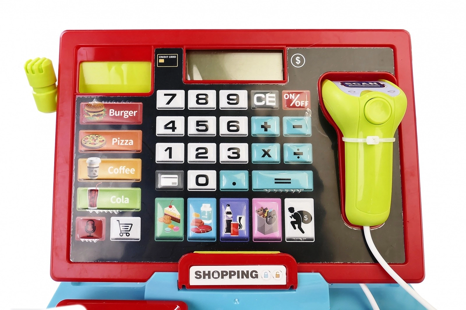 Die Kinderkasse mit Scanner und Waage bietet ein realistisches Einkaufsspiel. Sie verfügt über einen integrierten Taschenrechner, unterhaltsame Soundeffekte, ein Display mit zufälligen Zahlen beim Tastendruck und eine öffnende Geldschublade.
