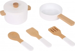 3 hölzerne Küchenwerkzeuge, Handtuch, Salzstreuer, Pfefferstreuer, 2 Töpfe mit Deckel