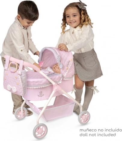 Die praktische Ausstattung umfasst eine abnehmbare Tasche für den Wagen oder zum Tragen in der Hand, eine Wannenabdeckung mit Ösen und kleinen Taschen, eine bequeme Matratze sowie unteren Stauraum für Kleinigkeiten. Spanisches Design und präzise Verarbeitung sorgen für lange Lebensdauer und täglichen Spielspaß.