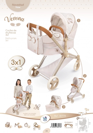 Die dezente Kombination aus Hellbeige und Weiß mit feinen Mustern, Schleifchen und gestickten Bienchen verleiht dem VERONA-Wagen einen zeitlosen Look, inspiriert von modernen Kinderwagen. Dank der Griffhöhe von 73 cm und der Kombination aus Wanne und Sportsitz ist er ideal für Vorschulkinder, die realistische Details und leichte Handhabung schätzen.