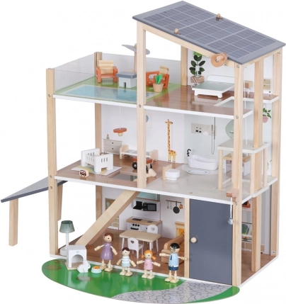 Zum Set gehören 41 Teile, darunter Möbel, vier Familienfiguren, das Haustier Kaninchen mit eigenem Häuschen und ein funktionierender Aufzug – einfach an der Kurbel drehen und die Familie in die oberen Etagen befördern. Die offene Konstruktion fördert natürliche Interaktion sowie die Entwicklung sozialer Fähigkeiten und der Feinmotorik.