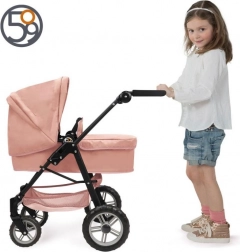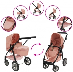 Stilvoller 2-in-1-Puppenwagen in Rosa mit hochwertiger Verarbeitung, abnehmbarem Sitz und der Möglichkeit, ihn in einen Sportwagen zu verwandeln. Dank verstellbarem Schieber, schwenkbarem Vorderrad und großem Korb ideal für kleine Mamas. Geeignet für Puppen bis ca. 53 cm.