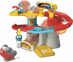 Entdecken Sie das CLEMENTONI BABY Spielset, das eine Feuerwehrstation mit einer Garage und einer dynamischen Rutsche verbindet. Zwei Somersault-Stationen sorgen dafür, dass jede Fahrt anders ist – einfach die Taste drücken oder den Hebel bewegen, und das Auto macht einen lustigen Überschlag oder ein Salto. Die Umgebung ist für kleine Hände gestaltet und bietet sicheres Spiel ohne scharfe Kanten.
