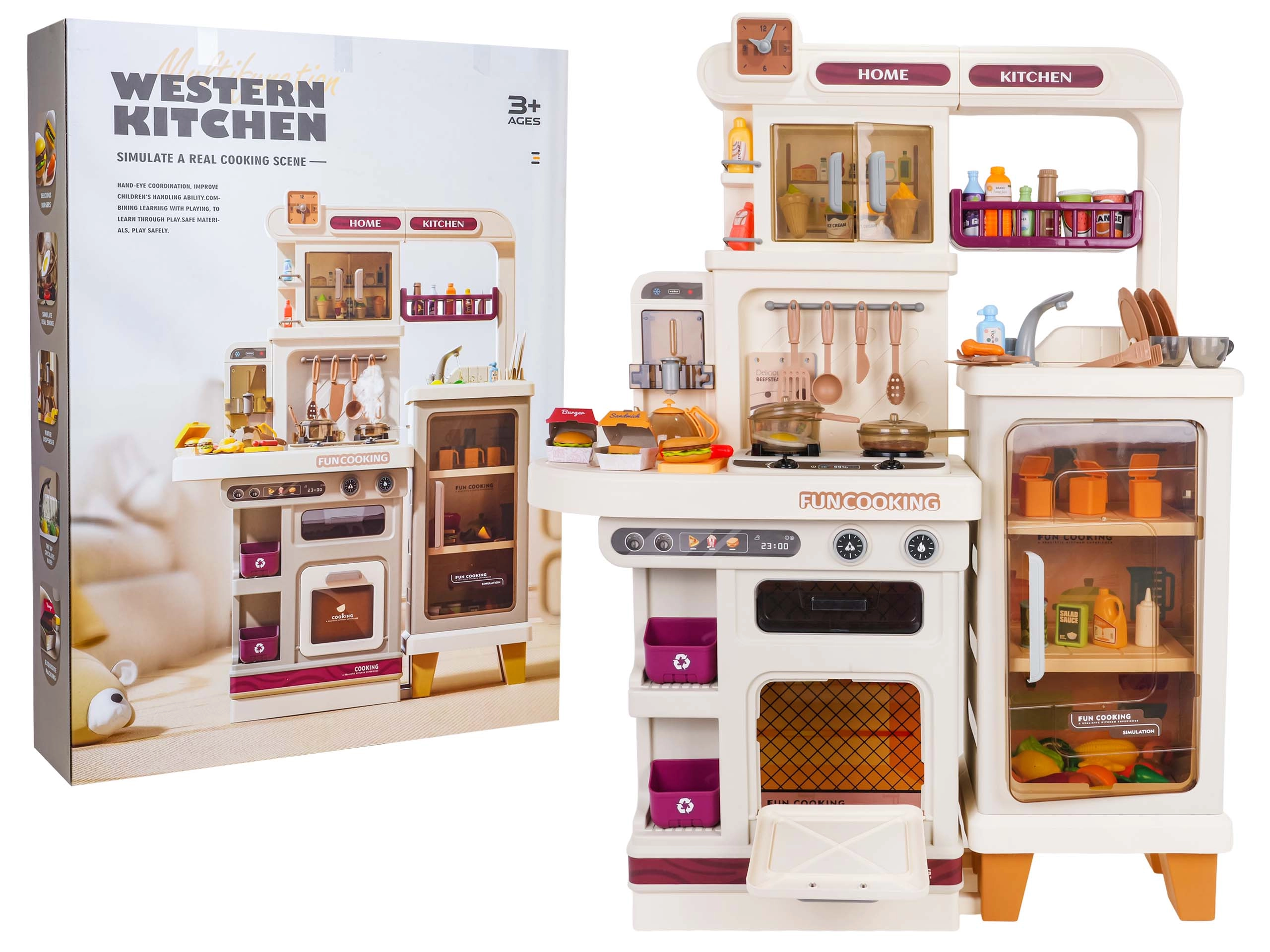 Im Lieferumfang befinden sich 93 Teile – Töpfe, Pfanne, Kanne, Geschirr, Besteck, Küchenutensilien, Gewürzstreuer, Mülleimer sowie eine große Auswahl an Lebensmitteln und Getränken. Uhr mit beweglichen Zeigern und Menü-Kärtchen sorgen für noch mehr Fantasie. Die Küche ist ideal zur Förderung der Feinmotorik, sozialer Kompetenzen und kreativen Spiels.