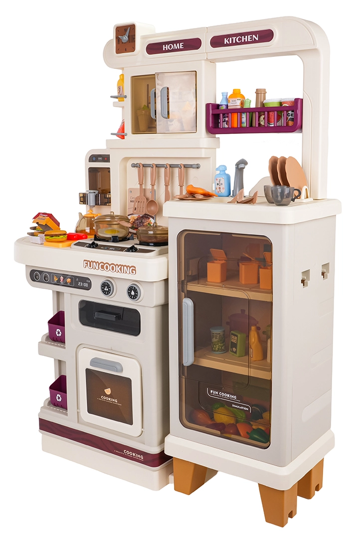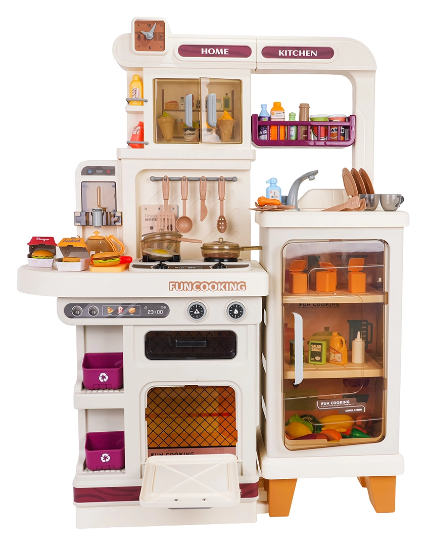 Diese multifunktionale Küche in elegantem Beigeton besteht aus hochwertigem, robustem Kunststoff und begeistert Kinder mit realistischen Funktionen. Die beleuchteten Kochfelder erzeugen Koch- und Bratgeräusche, aus einem Kochfeld steigt feiner Dampf auf und aus dem funktionierenden Wasserhahn fließt Wasser. Der öffnende Backofen und der Kühlschrank sowie Regale und Haken halten sämtliches Zubehör ordentlich an seinem Platz.