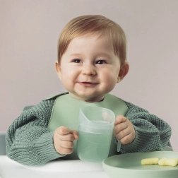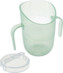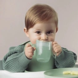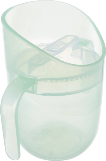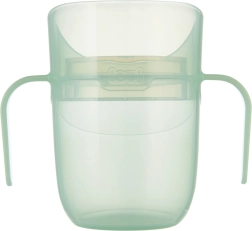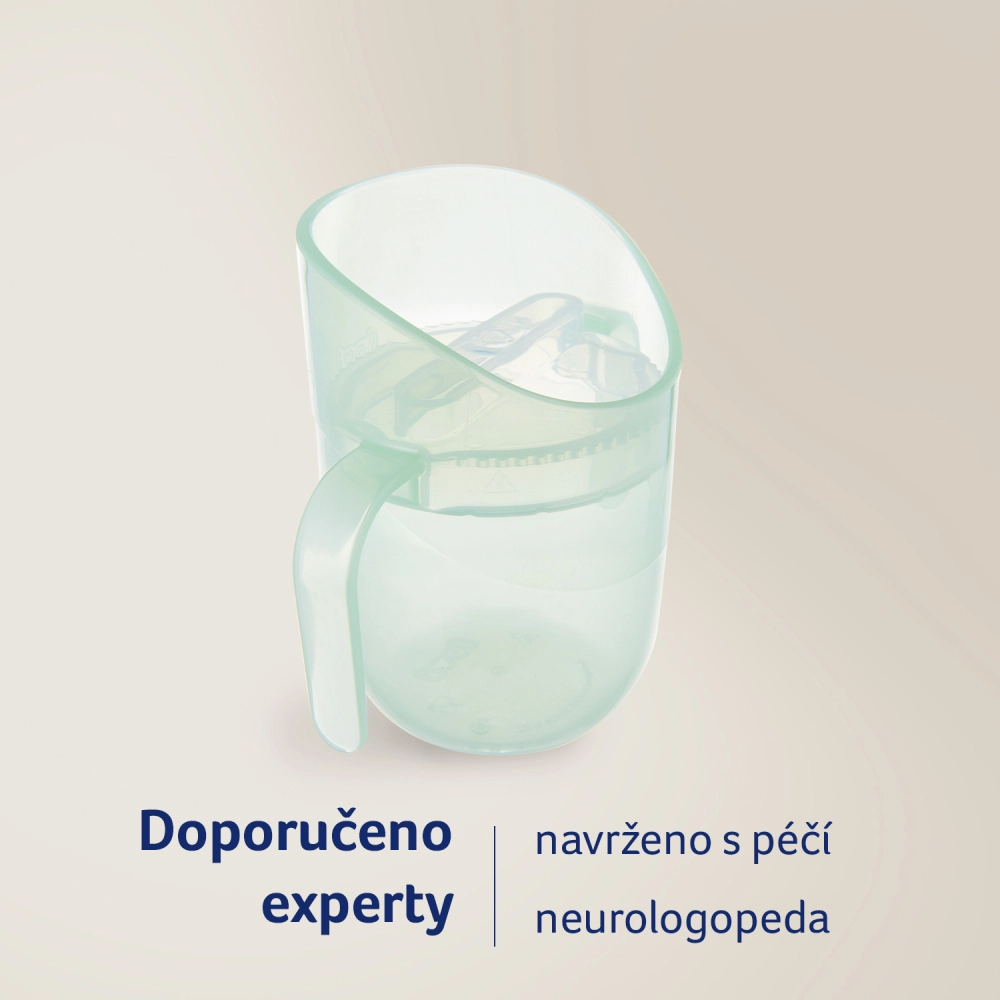 Die leichte Konstruktion, zwei breite Griffe und die kompakte Größe machen ihn zur perfekten Wahl für Anfänger. Sobald das Kind die richtige Technik beherrscht, entnehmen Sie den Einsatz, und der Becher wird zu einem offenen Becher mit 150 ml Volumen – ein Produkt, das wirklich mit dem Kind mitwächst.