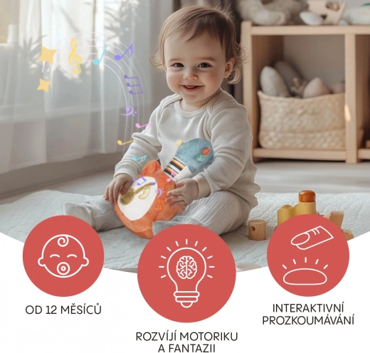 Bunte RGB-Lichter blinken im Takt der Musik. Abends wird das Spielzeug zu einem sanften Nachtlicht für ruhiges Einschlafen.