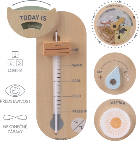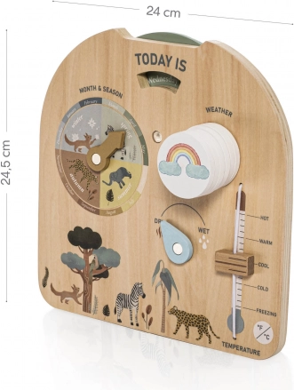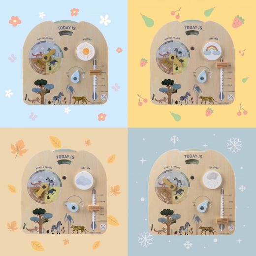 Die Holz-Montessori-Wettertafel ist für neugierige Vorschulkinder und jüngere Schulkinder konzipiert. Kinder lernen, Wochentage, Monate und Jahreszeiten zu unterscheiden, verstehen verschiedene Wetterarten, Luftfeuchtigkeit und Temperatur. Wunderschöne Illustrationen mit Tieren unterstützen die visuelle Wahrnehmung und machen das tägliche Ritual zu einem Vergnügen.