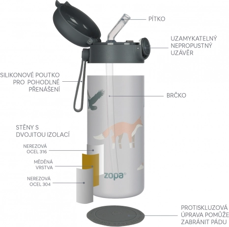 Die ergonomische Silikonschlaufe erleichtert das Halten auch für kleinere Kinder, und das Mundstück in Trinkhalmform unterstützt bequemes und sicheres Trinken ohne Kleckern. Die Thermoflasche besteht aus sicheren, BPA-freien Materialien und ist dank der Wiederverwendbarkeit zugleich umweltfreundlich.