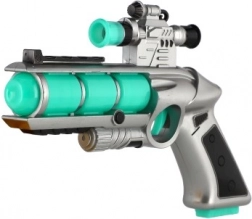 Das Design der Pistole erinnert an Waffen der Zukunft durch stilvolle türkisfarbene und graue Töne.