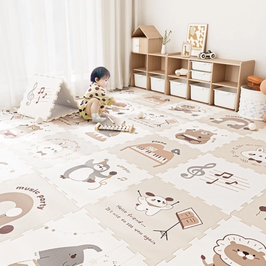Die Schaumstoff-Spielmatte Tierparty besteht aus 9 quadratischen Teilen, die exakt ineinander greifen und eine komfortable Fläche von 180 × 180 × 2 cm bilden. Das weiche, langlebige und sichere Material sorgt für eine angenehme Unterlage für die erste Bauchlage, zum Krabbeln und Spielen. Niedliche, als Musiker gestaltete Tiere und Noten-Motive regen die kindliche Fantasie an und fördern die sensorische Wahrnehmung.