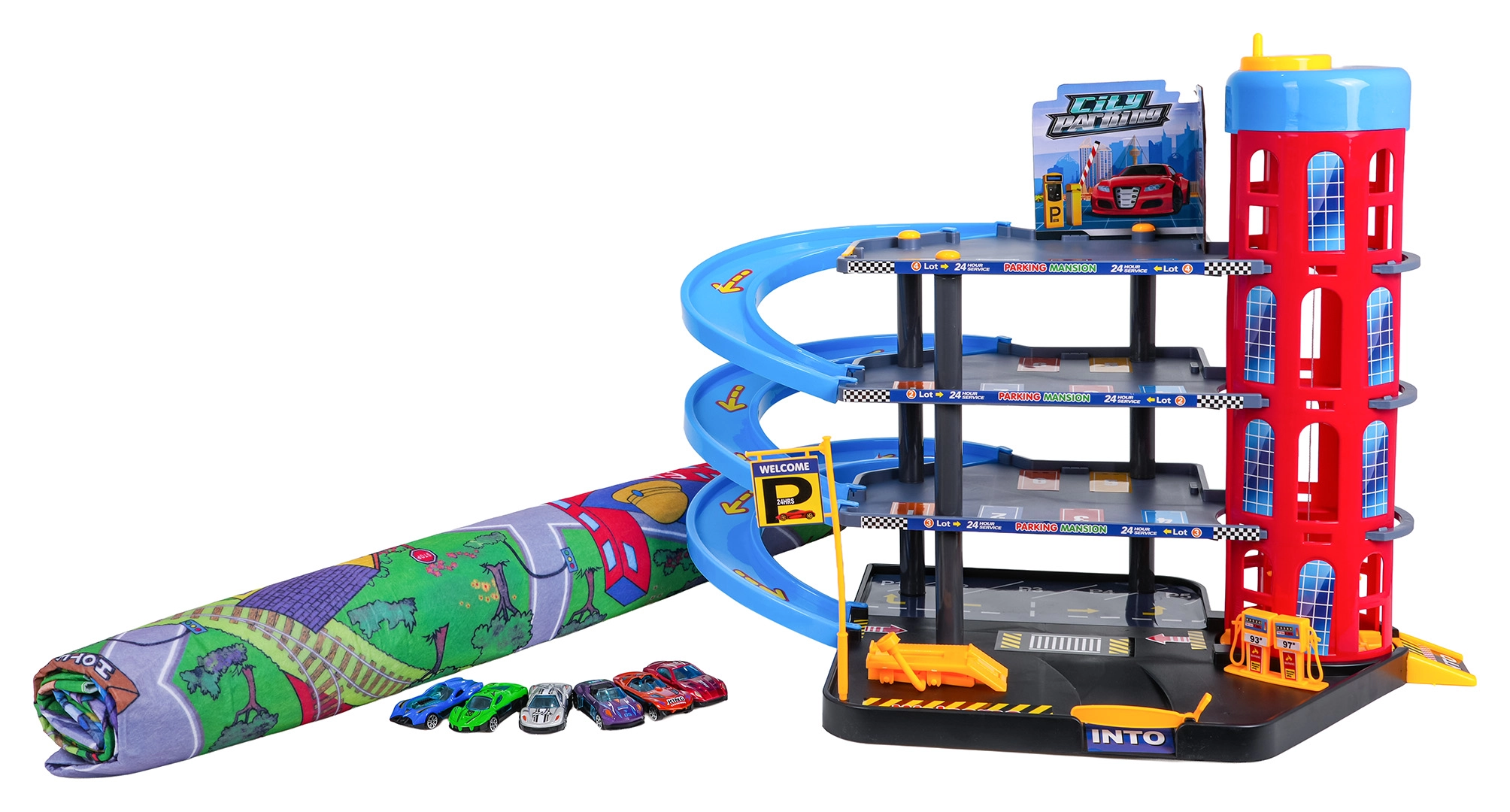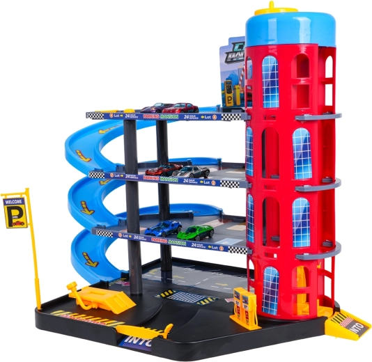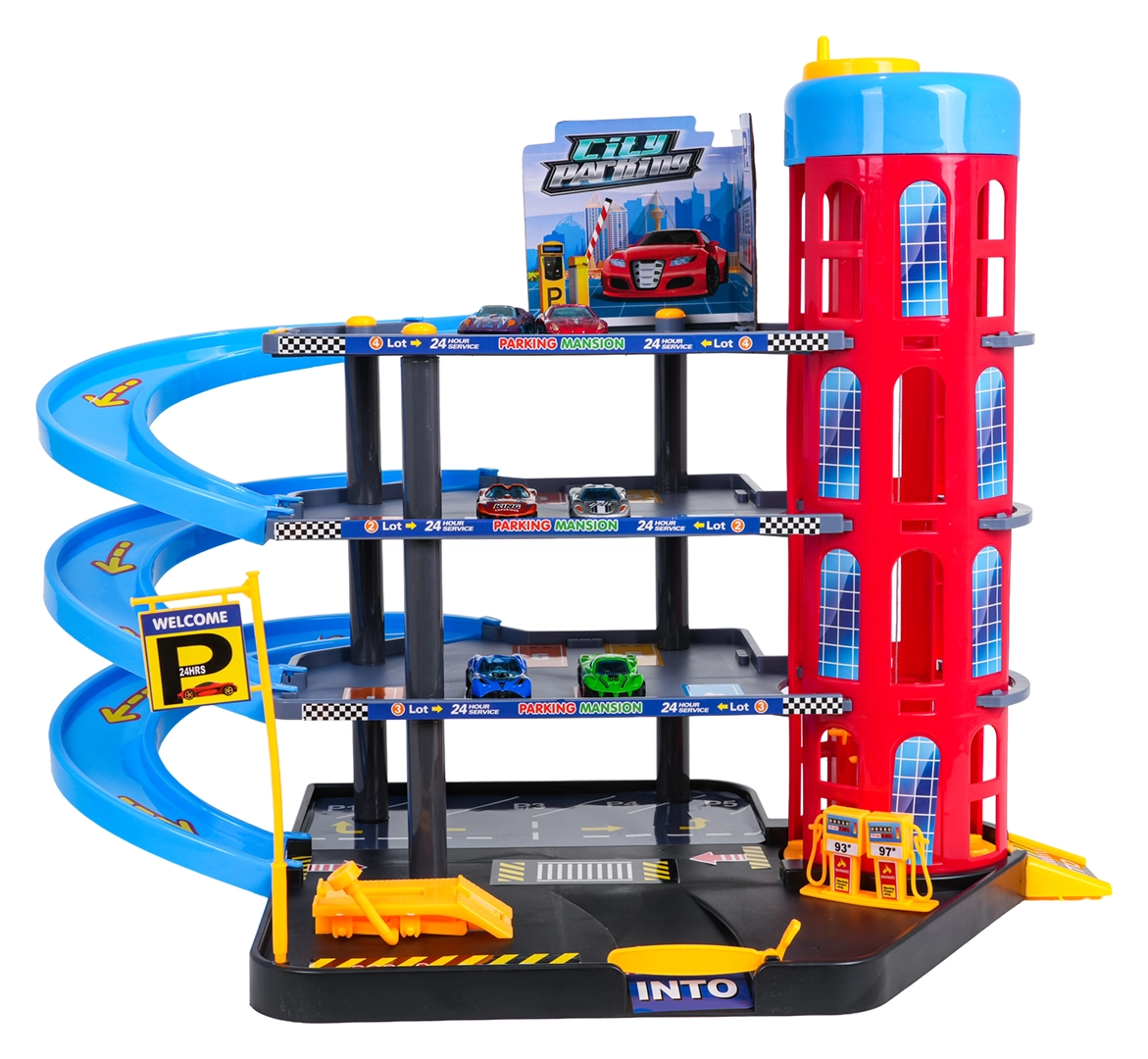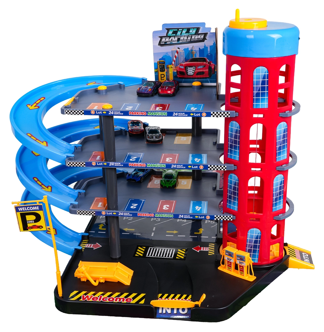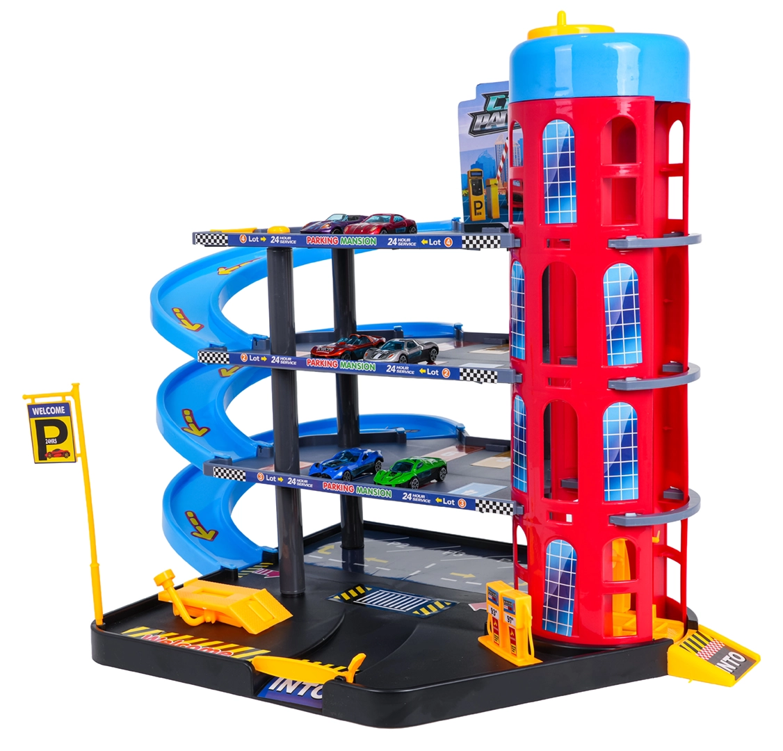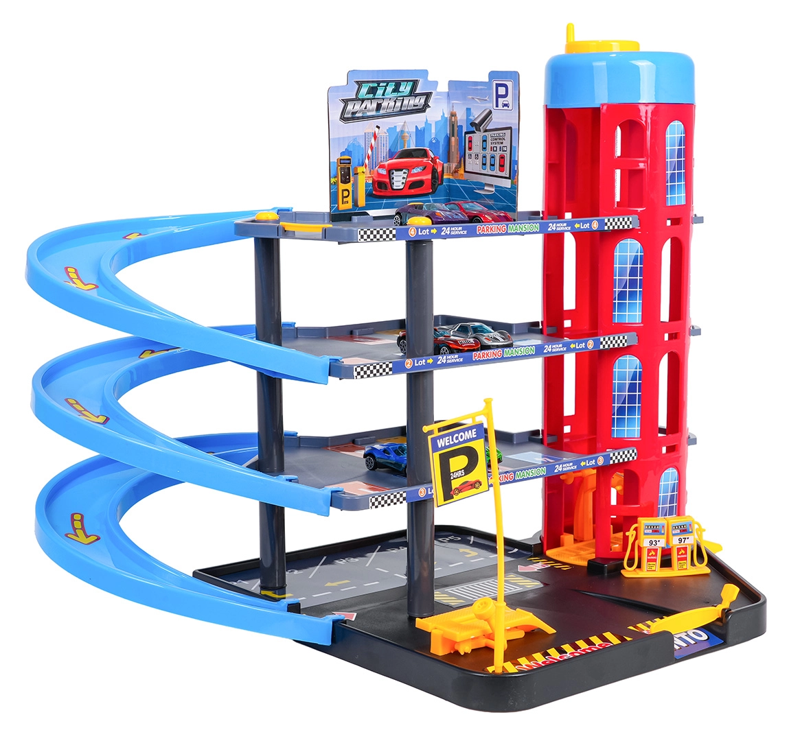 Dieses farbenfrohe mehrstöckige Parkhaus kombiniert realistische Stadtelemente mit dynamischem Fahrspaß. Kinder können die Autos mit dem manuell bedienten Aufzug nach oben befördern, auf den einzelnen Etagen parken und über die spiralförmigen Rampen hinunterfahren lassen. Die integrierte Tankstelle, Service-Hebebühne und die Schrankenauffahrt unterstützen fantasievolles Spielen.