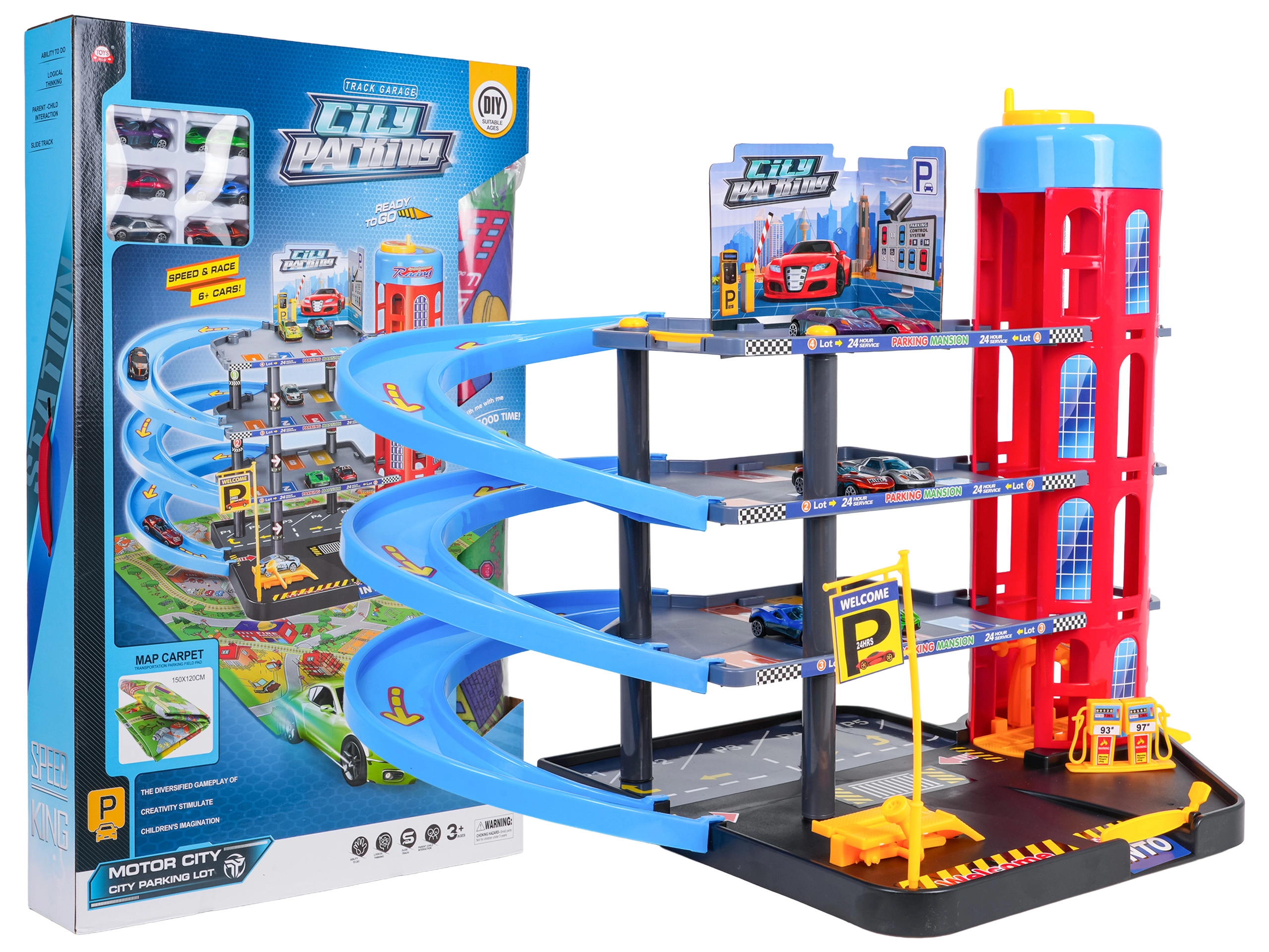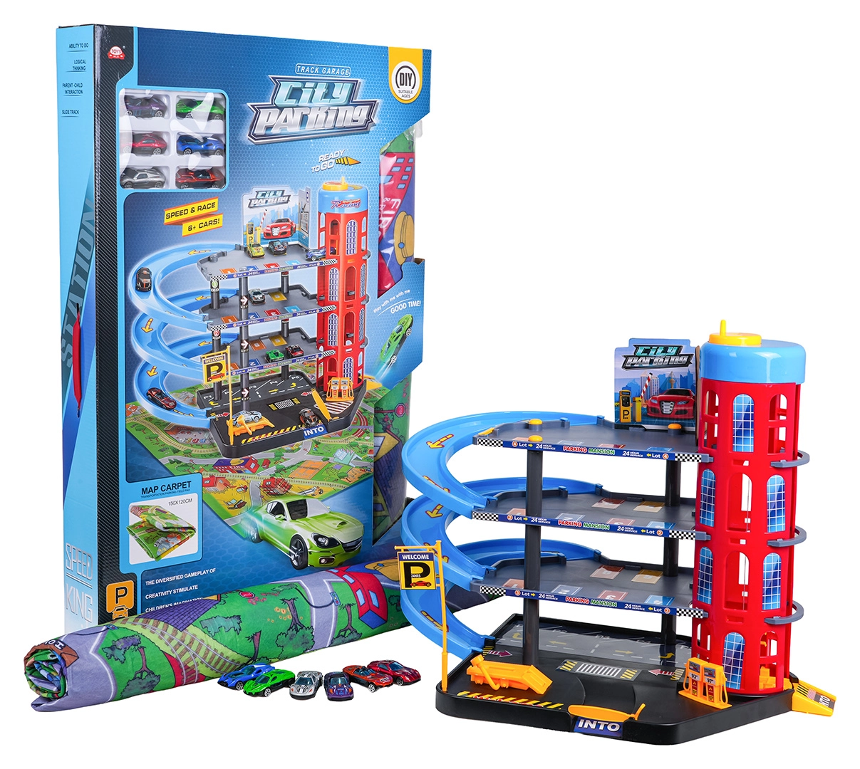 Im Set enthalten ist eine große Filzmatte mit Straßen, die die Spielfläche erweitert, sowie 6 robuste Autos mit Metallkarosserie für sofortige Rennen. Die langlebige Konstruktion und durchdachte Details machen das Parkhaus zum idealen Set für den täglichen Spielspaß.