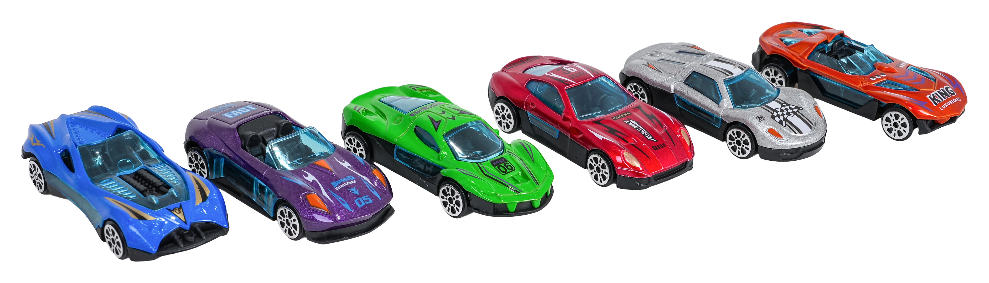 Sofort spielbereit: sechs robuste Autos mit Metallkarosserie, leichtlaufenden Rädern und sportlichen Dekoren für endlose Rennen.