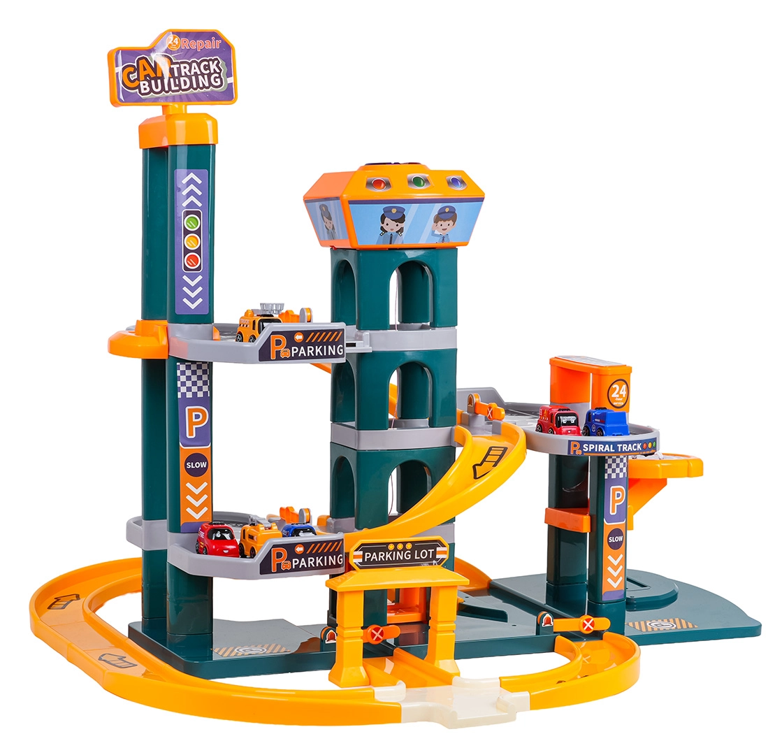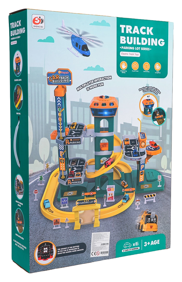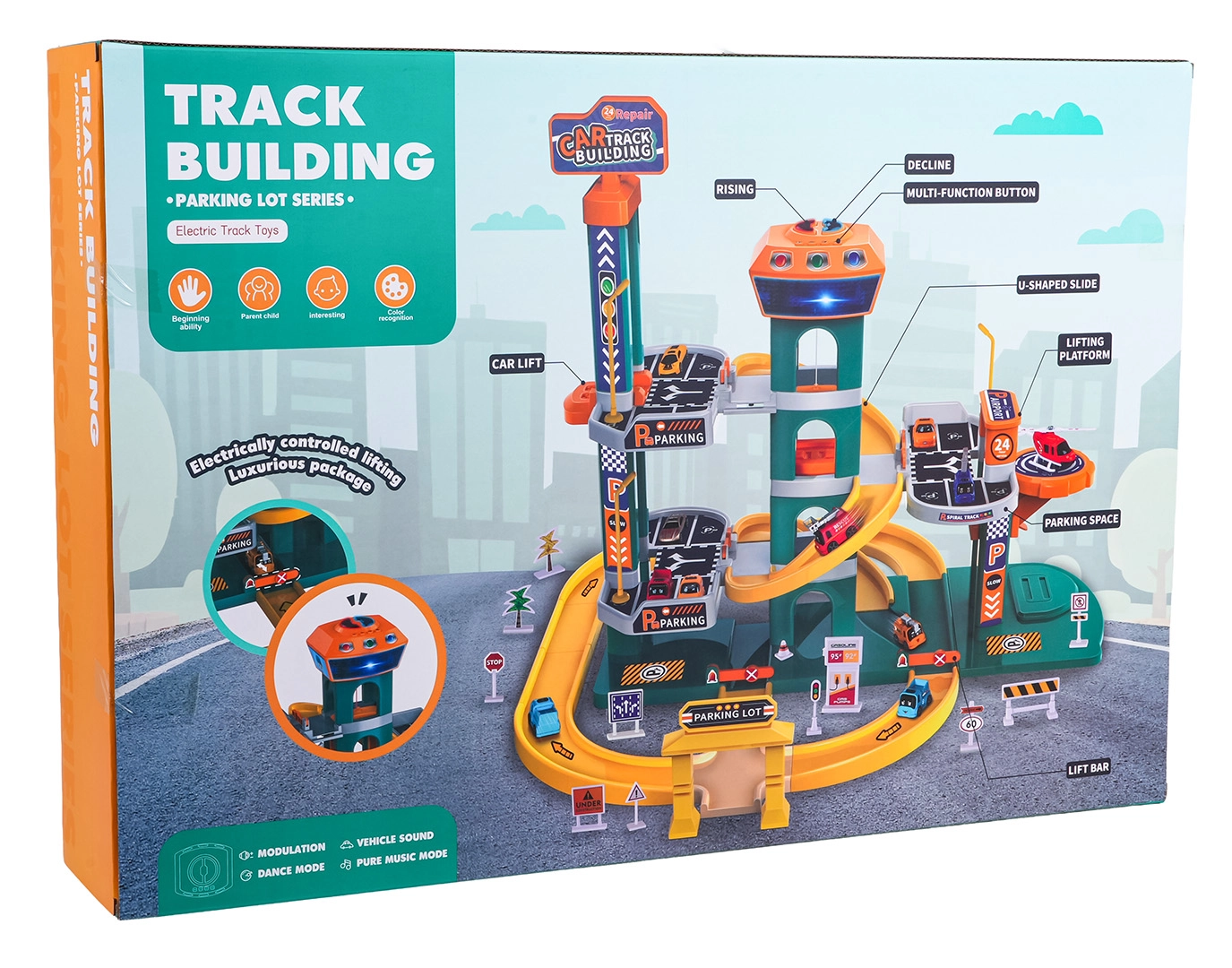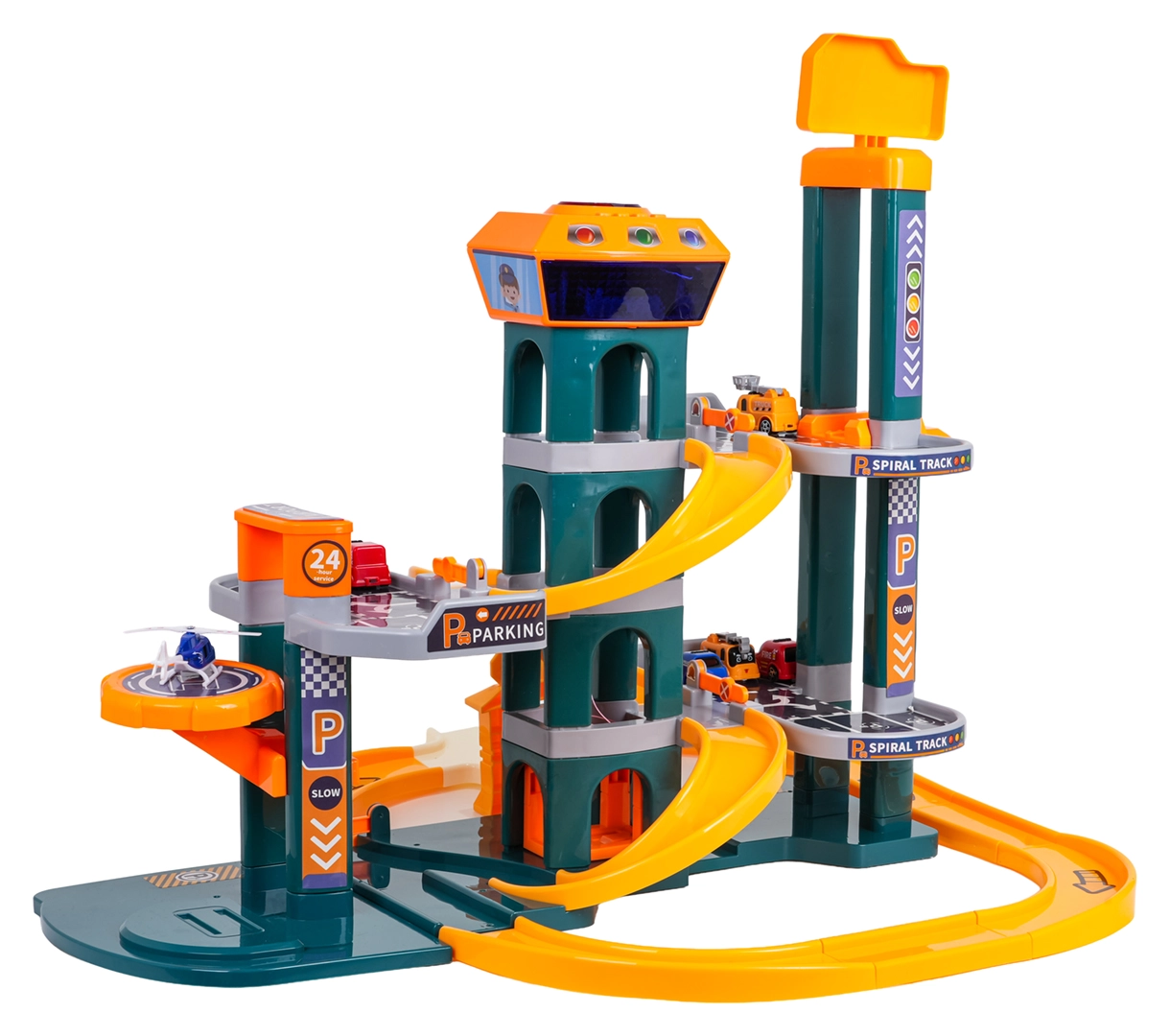 Verschiedene Strecken, Abfahrten und Parkplätze fördern kreatives Spielen und Rennen. Kinder können die Fahrt mit dem Aufzug abwechseln mit der Abfahrt über die gewundene Strecke.