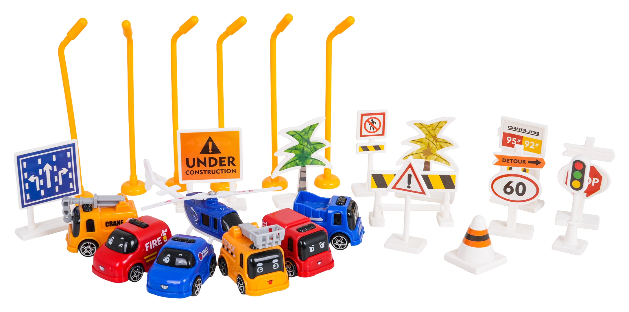 6× Auto (2× Kran, 2× Feuerwehr, 2× Polizei), 1× Hubschrauber, Verkehrszeichen, Schranken, Lampen, dekorative Aufkleber