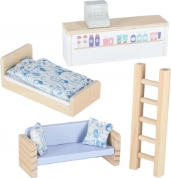 Bett mit Bettzeug, Sofa, Tisch, Regal, Leiter sowie Laden-Elemente bieten viele Möglichkeiten für kreatives Spiel.