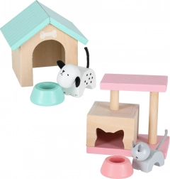 Enthalten sind Figuren von Hund und Katze, Näpfe, Hundehütte und Kratzbaum – perfekt für die Tierpflege und Rollenspiele.