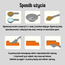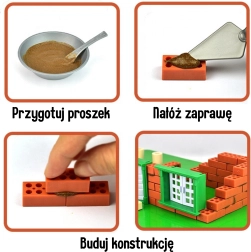 Die Handhabung ist einfach: Pulver im Verhältnis 1:1 mit Wasser mischen, Mörtel mit der Spachtel auftragen und die Ziegel Schicht für Schicht setzen. Für die Wiederverwendung das fertige Haus 1–3 Stunden in warmes Wasser tauchen – der Mörtel löst sich, und die Teile können erneut verwendet werden. Das mitgelieferte Kinderwerkzeug vermittelt die richtigen Bewegungen und fördert die Feinmotorik.