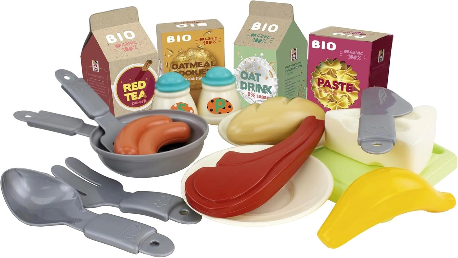 • 19-teiliges Set – Pfanne, Teller, Besteck, Lebensmittel und weiteres Zubehör.