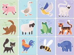• 24 große Motive: 12 Tiere + 12 Alltagsgegenstände