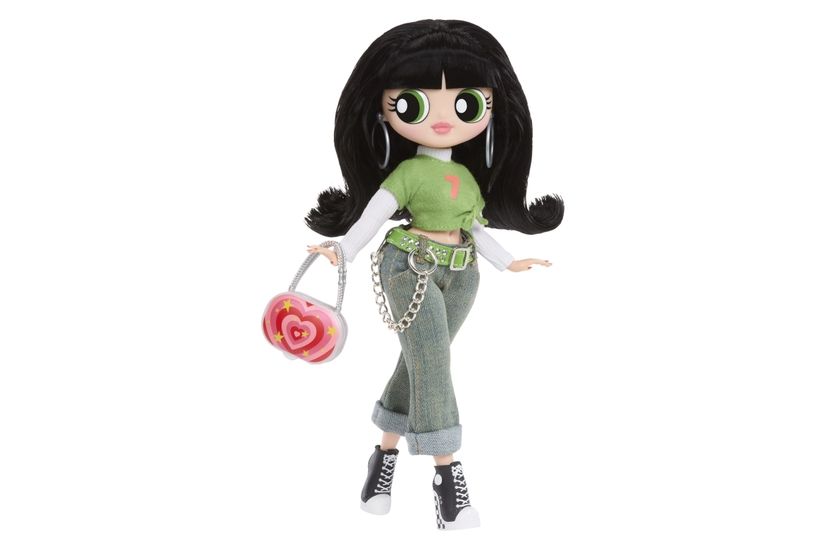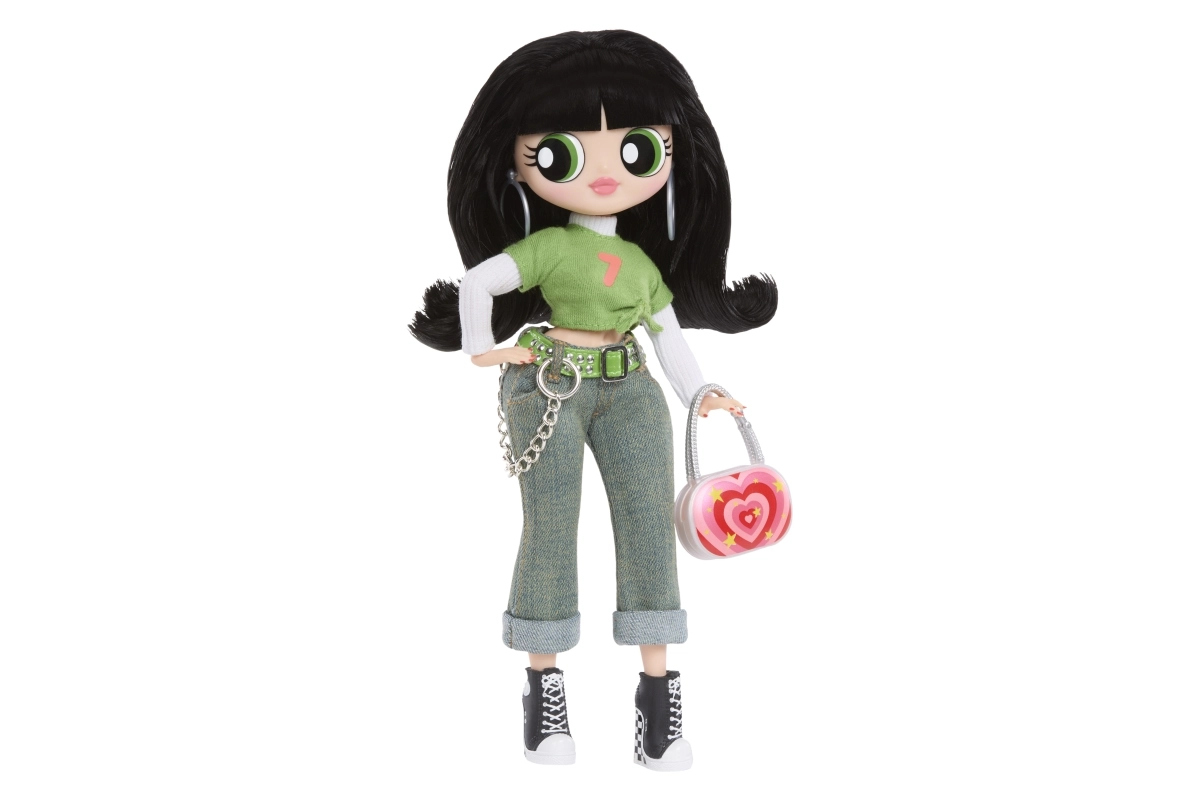 Grünes Crop-Top, Jeans mit Kette und schwarze Sneaker werden durch eine auffällige Tasche und Ohrringe ergänzt – der ikonische Buttercup-Look im L.O.L.-Style.