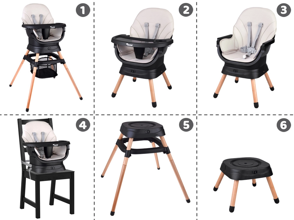 Der praktische multifunktionale Hochstuhl 6-in-1 wächst mit Ihrem Kind mit und bietet sicheres und komfortables Sitzen zum Füttern und Spielen. Dank des 360° drehbaren Sitzes mit 8 Positionen, dem Fünfpunktgurt und der leicht zu reinigenden Konstruktion passt er hervorragend in Küche, Esszimmer und Kinderzimmer.
