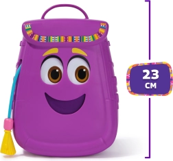 Der lila Rucksack mit freundlichem Gesicht lässt sich leicht öffnen und fasst sämtliches enthaltenes Zubehör – ideal für unterwegs und für das Spielen zu Hause.