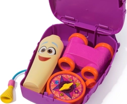 Enthalten sind thematische Entdecker-Tools: ein Fernglas für weit entfernte Objekte, ein bunter Kompass zur Orientierung und eine ausziehbare Karte mit Bildszene zum Planen von Ausflügen. Das perfekte Spielzeug zur Förderung von Fantasie, Rollenspiel und Feinmotorik.