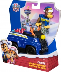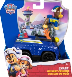 Detailreiches blaues Fahrzeug mit weihnachtlichen Elementen und beweglichen Rädern. Die CHASE-Figur mit Wintermütze sitzt direkt im Cockpit und ist einsatzbereit.