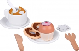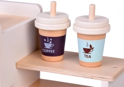 Umfangreiches Zubehör umfasst Tassen mit Untertassen und Löffeln, To-go-Becher mit Deckeln (Tea, Coffee), einen Milchkarton, Besteck, verschiedene Törtchen, Muffins, Kekse und Schokolädchen sowie eine einfache Speisekarte. Alles ist perfekt für kleine Hände geeignet und unterstützt die Feinmotorik, Hand-Auge-Koordination und soziale Fähigkeiten.