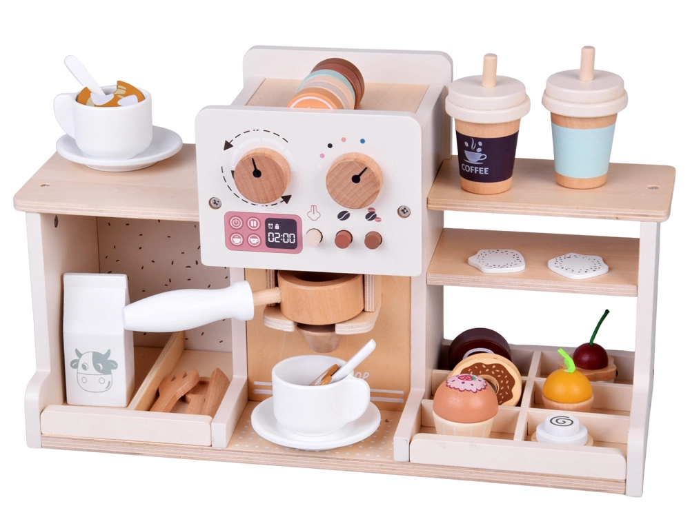 Entdecken Sie die Magie der Barista-Welt mit dem Holz-Café, das aussieht und funktioniert wie ein echtes. Kinder können die Stärke des Kaffees mit drehbaren Knöpfen „einstellen“, die Brühgruppe/den Portafilter einsetzen, Kapseln für Kaffee oder Tee auswählen, „Milch“ aufschäumen und Desserts auf Tellern servieren. Die robuste Holzkonstruktion mit sicheren Farben und einer sanften Pastellpalette sorgt für Langlebigkeit und eine schöne Optik im Kinderzimmer.