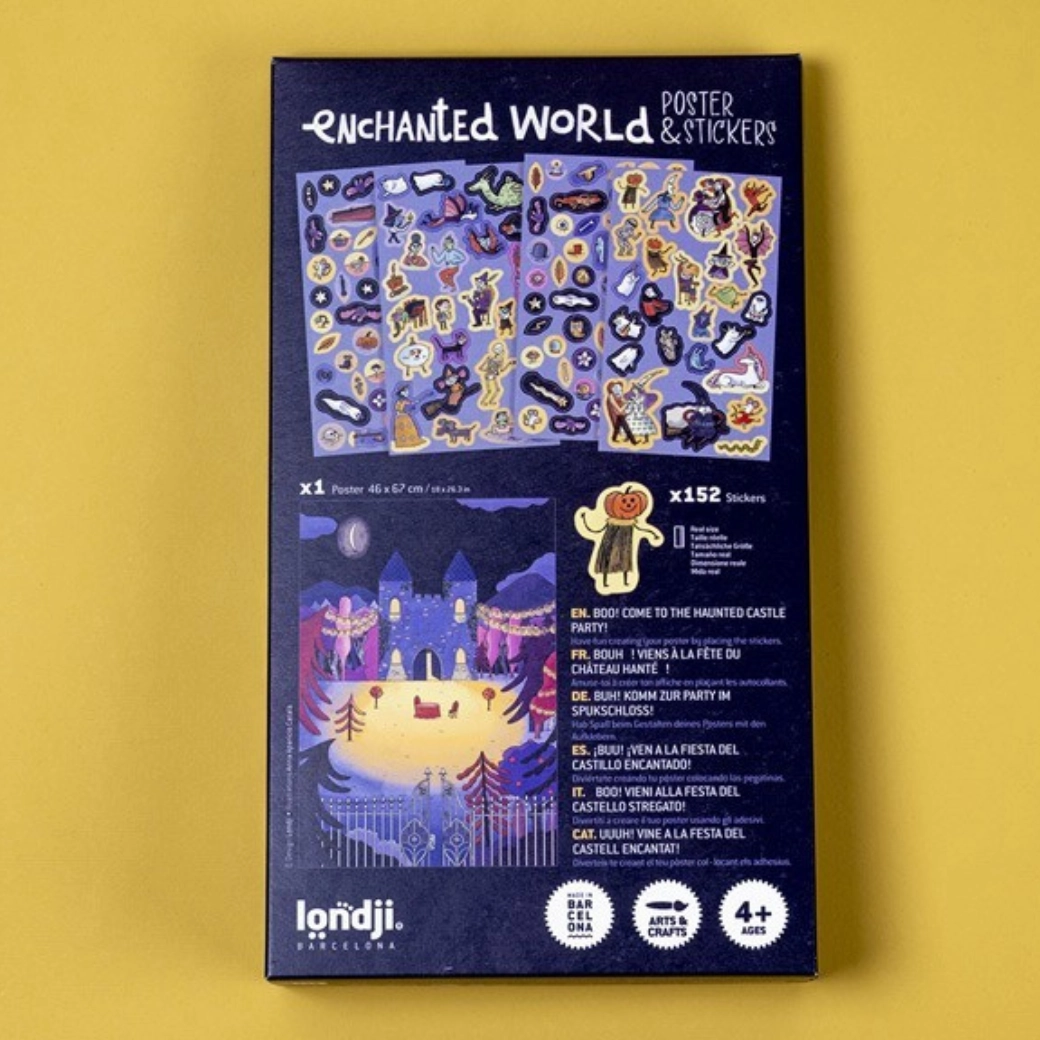 In den Fenstern gehen die Lichter an, Schatten tanzen und aus den Tiefen des Schlosses erklingt geheimnisvolle Musik … Mit diesem Kreativ-Set erwecken Kinder ein Spukschloss ganz nach ihrer eigenen Vorstellung zum Leben. Das großformatige Poster dient als Kulisse, die mit Dutzenden thematischer Sticker – Geister, Fenster, Fledermäuse, Figuren und geheimen Ecken – ergänzt wird.