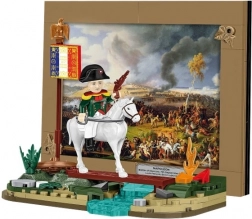 Das zentrale Element ist eine detaillierte Minifigur Napoleons in typischer Pose im Sattel eines weißen Pferdes – ideal für historische Szenen und die Sammlervitrine.