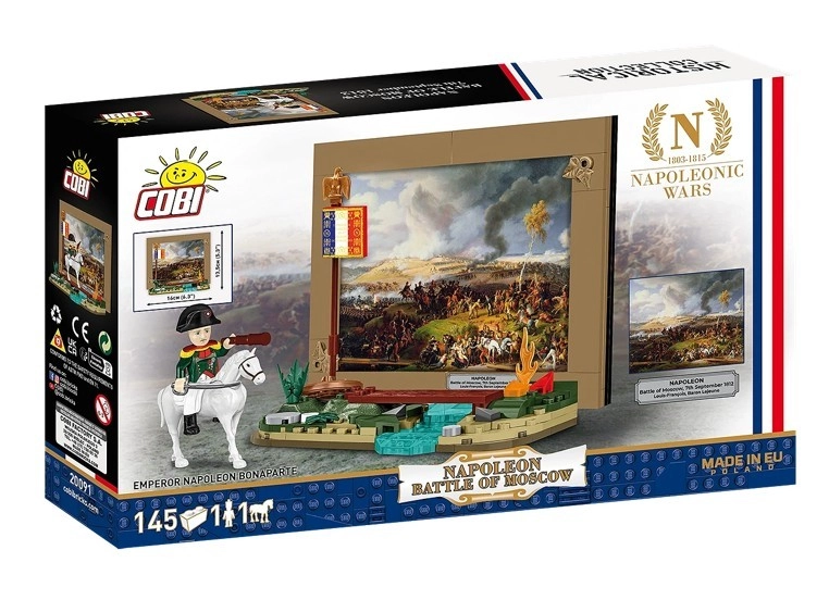 Erleben Sie den Schlüsselmoment des Russlandfeldzugs und bauen Sie eine Szene, die Geschichte, Kunst und Bauspaß vereint. Das Set COBI Napoleon – Schlacht bei Moskau bietet ein detailliertes Mini-Diorama mit gerahmtem Bild der Schlacht bei Borodino, der ikonischen Figur Napoleon Bonaparte zu Pferd und einer sorgfältig gestalteten Landschaft für einen effektvollen Display oder Spielspaß.